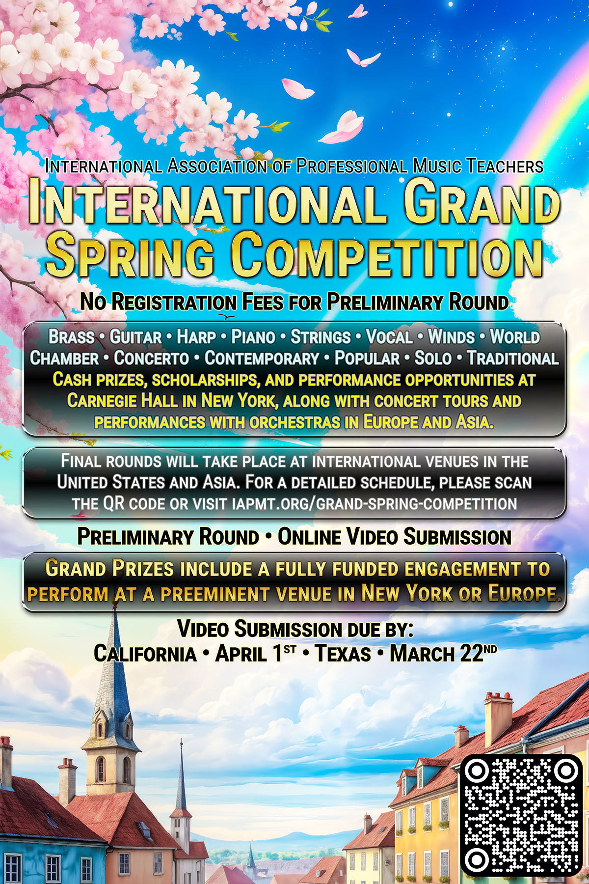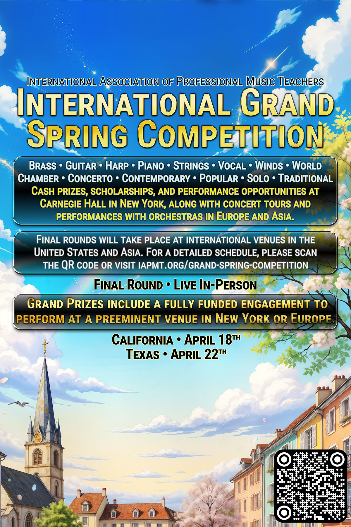 “IAPMT encourages students with all levels of talent to participate and receive a myriad of benefits. Although the word “Concours” implies a highly competitive environment, we strive instead to provide a very “encouraging” one. Our Judges will always provide helpful comments and advice which can help you flourish as a musician and become the best version of yourself.”
