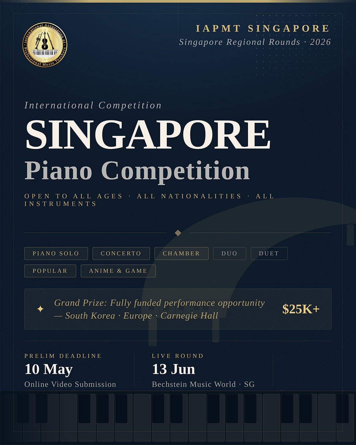 “I am excited to join the IAPMT and contribute to its vital mission of making high-quality music education accessible to students of all backgrounds and abilities. I am eager to support the organization’s unique exam and competition platforms, which empower the next generation of musicians to fully develop their creative gifts and ensure the tradition of musical excellence continues to flourish.”