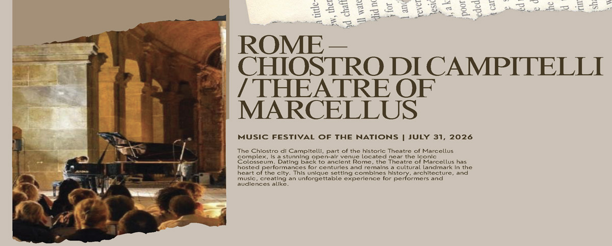 - 국제 음악 축제 | 2026년 7월 31일: 키오스트로 디 캄피텔리/마르첼로 극장. 고대 로마 시대로 거슬러 올라갑니다. 마르첼로 극장은 수세기 동안 공연을 개최해 왔으며, 도시 중심부의 문화적 랜드마크로 남아 있습니다. 이 독특한 환경은 역사, 건축, 음악을 결합하여 연주자와 청중 모두에게 잊지 못할 경험을 선사합니다.